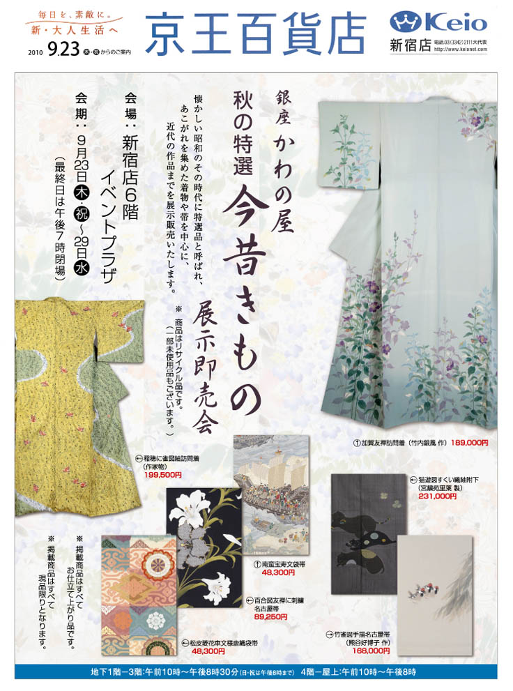 下の写真をクリックすると、大きい画像をご覧いただけます。 京王百貨店 新宿店での『今昔きもの市』も、今回で4回目となりました。 個性あふれる楽しい12店が出店いたします。 「銀座 かわの屋」では、季節感あふれるテーマの着物や帯を取り揃えました。 また、一足早く秋のフォーマル、お洒落着など お出かけに最適なアイテムもご用意いたしております。 「理由ありお買得コーナー」 ちょっとした工夫で着用可能な、またリメイクにもお使いいただける着物や帯など お買得品がたくさんございます。 浴衣も1,890円からご用意しております。 是非一度お立寄りくださいませ。 出店: きも乃 たき川/洒落きもの 助六/きものや由布/美々/きものCITY きもの今昔処 和楽市/きもの らぐたいむ/今・昔きもの帯 悦 暮らし家/Ponia−pon/人形町 こべに屋/銀座 かわの屋 ※商品のお取置き等はお受けいたしかねます。 ※イベント期間中は、メールでのお問合せの対応が遅れる場合がございます。 ご迷惑をおかけいたしますが、ご了承くださいませ。