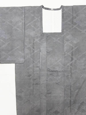 今回は少し珍しく、大きめの四菱の文がところどころに散らされた地紋のある生地が使用された、鮫小紋の道行コートです。
