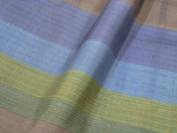 こちらは経に細い縞が織られ、反物の片側だけに横絣が10センチ位のところですーっと消える様な柄に織られた紬に、藍と緑と茶の3色の経縞が引き染で染められたとても凝ったお着物です。
