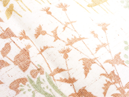 野に咲く草花が弁柄色と蓬色、そして菜種油色のパステル調で動きのある形のシルエットで描かれているのが面白く楽しいリズムが聞こえてきそうです。