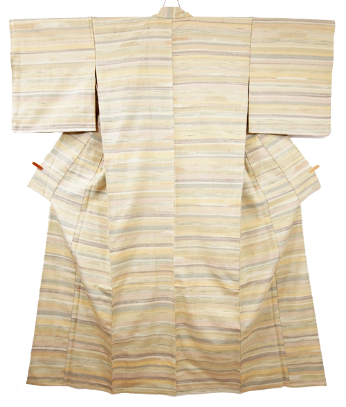 段々のランダムな横縞に見えますが、ひとつの縞の中でも同じ色で織り方を変えていたり、絣糸が織り込まれていたり、山の形の絣で色が織り分けられていたりとかなり複雑なものとなっていて、見るからに手の込んだ高級感の感じられる素敵なお着物となっています。