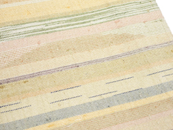 すべてご紹介しきれないほどたくさんの種類の色が使用されていますが、どれもトーンの揃ったパステル調のやわらかい色ばかりですので、縞自体が強すぎるという事はなく、約12色の糸の楽しいハーモニーの様にも見えます。