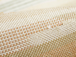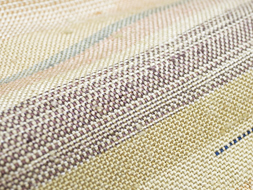 こちらは、今回のご案内状に掲載した藍色系の経縞の作品(4段目写真参照)とは少し違った印象の淡色系の横段絣のものです。