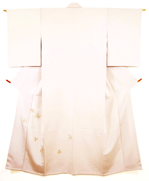 グレー味というか青味の感じられる薄く淡いピンク地に、同系色の糸で早い春に咲く白いスズランの花を上から見た形にデザインして、手刺繍で描いた附下のお着物です。