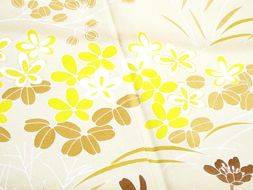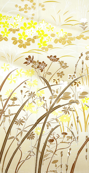 友禅だけでこれほどのボリューム感がある事も目を引き、お花もひとつひとつを目で追うと「ここにもタンポポが、あらここにはスミレが」と楽しくなります。
