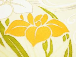 目に鮮やかな明るい萌黄色の地に、上前から下前にかけて斜めに女郎花色の暈しが染められて、そこに水の輪が描かれ、大きめの丸紋の形にアレンジされた花菖蒲が散らされた見応えのある単衣の訪問着のお着物です。