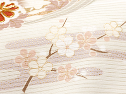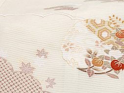 梅、松、桜、橘、菖蒲、もみじに青海波、そして宝尽しと様々なモチーフが盛り込まれていて、上前には手刺繍や金彩も加えられ、華やかでおめでたい雰囲気を醸し出しています。