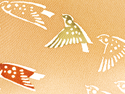 これからの季節にとても魅力的な、こっくりとした濃い黄色・黄唐茶色の地に色々な形に飛び交う小さな可愛い雀がたくさん描かれた型染めの小紋のお着物です。