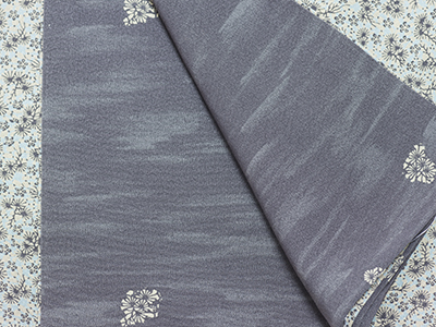 こちらはグレー寄りの水浅葱・湊鼠色の地に、細やかな根引松とその間に桜の花びらが散らされた素敵な模様です。