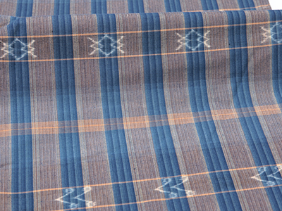 緯糸はヤマモモの赤でしょうか、渋さのある赤茶・赭色が可愛い絣の模様を交えて織り出されています。段によって濃淡があり、グラデーションが交差する独特の個性があふれています。
