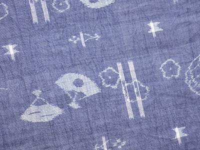 小さな絣の模様をひとつずつ紐解くように見ていきますと、日の丸の御扇子は桃太郎でしょうか、竹林で宝物を掘っているかぐや姫の一場面のような模様も見られます。 俵の鼠を連想するものもあり、次々と発見があって楽しく思えます。