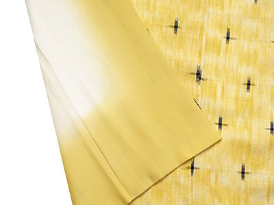 地織の部分は黄色と白の霞暈しのようなかすれたような雰囲気に織られていて、そこに黒い十字絣がくっきりと織り込まれ、水玉模様のようで軽快な印象になっています。
