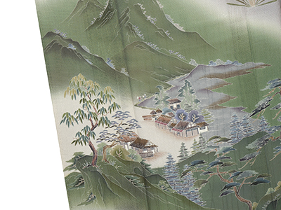 変り経涌模様の地紋のある経絽の生地が、少しシャープさのある銀鼠色に染められ、山里の風景が細やかな友禅で描かれています。