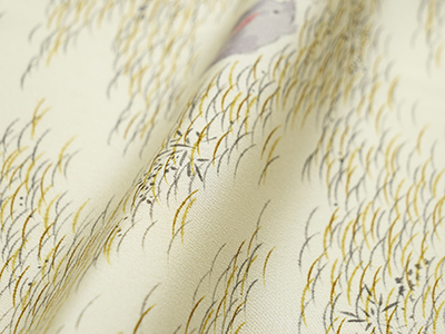 練色の明るいベージュの地に細い線で野原の草が描かれ、そこかしこにグレーと白の可愛いウサギが遊んでいる様子が染められた一方附の小紋のお着物です。