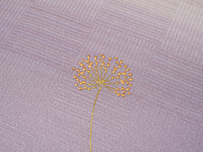 生地の光沢と地色の薄紫の色の変化がとても綺麗で、少し大人っぽいシックな色合いとなっていて、それとは対照的にタンポポの綿毛は可憐なイメージなのですが、金彩で描かれている事によってとてもスマートで個性的な印象となっています。