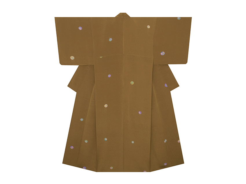 黄色味のある焦げ茶・芝翫茶色のちりめん地に、直径が約2.5〜3.5cmの丸が置かれ、緑青色、古代紫色、空五倍子色などに色付けされた中に小さなお花が描かれた小紋の袷のお着物です。