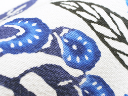 もう一点の帯地と同じく藍の濃淡で描かれていますが、こちらは白場が少なく、柄としてはボリューム感があります。