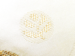 波の模様のそばに寄り添う様に織り出された小さな菱と丸の中にもそれぞれ花や草が織り込まれ、弾む様なリズムが感じられます。