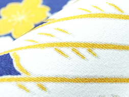 こちらは紫味のある藍色の地に白揚げで流れる水の線が躍動的に引かれ、少し大ぶりな花筏が菊と桜で豪華に描かれています。