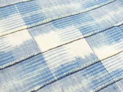藍の色は5段階くらいの濃淡で絣糸に染められていて、その絣の足も味わい深く、全体の大胆な構図には目をうばわれる、そんな大作です。