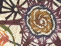 少し赤味のあるキビラの麻の地色と、巻貝の濃い似せ紫色と紺瑠璃色とのメリハリが非常に快活で元気の良い、楽しさのある作品です。