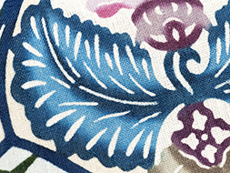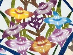 紅型染めならではの醍醐味のある構図と図案、藍の濃淡の輪郭とその中に染められた白藍の瑞々しさ、そしてひとつのひとつの図案の中に咲く花々の可憐さを梅鼠色、芥子色、勿忘草色など色とりどりに描かれています。