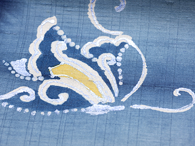 板締め絞りならではの綺麗な藍の濃淡に「天の川みたいですね」と思わず言葉が出ましたが、自然の草花や蝶々、そして鳥などが、鈴木先生らしい可愛い調子で描かれているのに、なぜか宇宙への限りないような広がりを感じて驚きました。