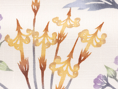 鍋島更紗で著名な故・鈴田照次氏の元で学んだ卒業生に手ほどきを受けられたり、佐賀大学教授である故・城秀男氏の研究会に聴講生として入られたりと、基本的な事から勉強をされて、ご自身が大変お好きな野に咲く草花をデザイン化する事も学ばれました。