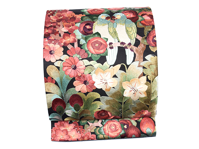 秘密の花園のようなエキゾティックな雰囲気のある薔薇や百合のお花が咲き乱れる中に、仲良くお話をしている様子のインコが2羽描かれた総刺繍の袋帯です。