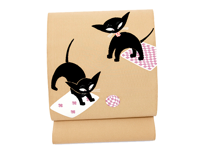 【商品説明】 子猫がトランプと小さなボールで遊んでいる様子が織り出された名古屋帯地です。 当店が以前にアンティークのものを主流に扱っていた事から手元にたくさんの資料があり、その中にこちらのアールデコの帯もあったのですが、今回おび弘さんに綴れ織で復元していただきました。 子猫の部分はもこもことしたビロードで織られていて、いたずらっぽい表情が何ともかわいく、どんなお着物に合わせようかとわくわくしてしまいます。 トランプやボールのチェック模様や首輪の水玉など、細かい部分にもアールデコの雰囲気をお楽しみいただけます。 今回は色違いで2色織っていただきましたが、それぞれ違った雰囲気で素敵な帯地に仕上がり嬉しく思っています。 お出かけ先でもお話に花が咲きそうな素敵な一点です。