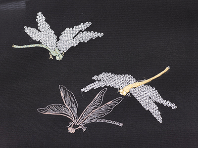 細やかな疋田の模様も中心の目も刺繍で表現されていますが、少し離れると染めのようにも見えて不思議です。