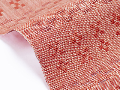 芭蕉布本来のベージュと茜色の織り成すニュアンスのある赤が非常に魅力的な光沢を持って輝いています。