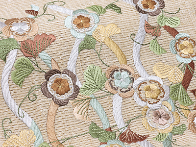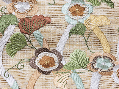 少し太い経涌の模様が光沢のある白菫色をベースに、榛色、焦茶色、水浅葱色などで変化をつけて描かれ、それに絡むように蔓の花が同じトーンの色合いでまとめられ刺繍されています。