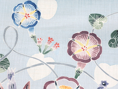 お花は紺瑠璃色、葡萄鼠色、紺藍色などで染められ、葉は松葉色に濃い千歳緑色で紅型の隈取のような暈しが入れられています。