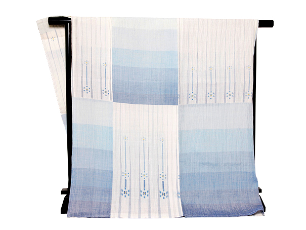 全体に大きな市松の形に区切られ、ひとつの四角の中は藍の濃淡が暈しの様に段々と淡く薄くなっていくもの、もうひとつは細い線に小さな可愛いお花の絣が寄り添っているものとなっていて、タイトルからお花の部分は雪の結晶に見る事もできます。