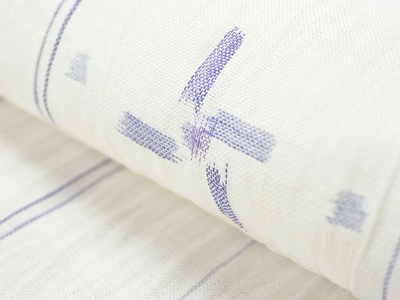 極細の縮の糸からなるもの、上質な細い麻の糸からなるものの違いはありますが、寄り添う藍色のラインの繊細さと白とブルーの絶妙なハーモニーによって、線の動きを変えながら作品のテーマごとに美しく表現されます。