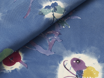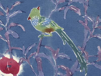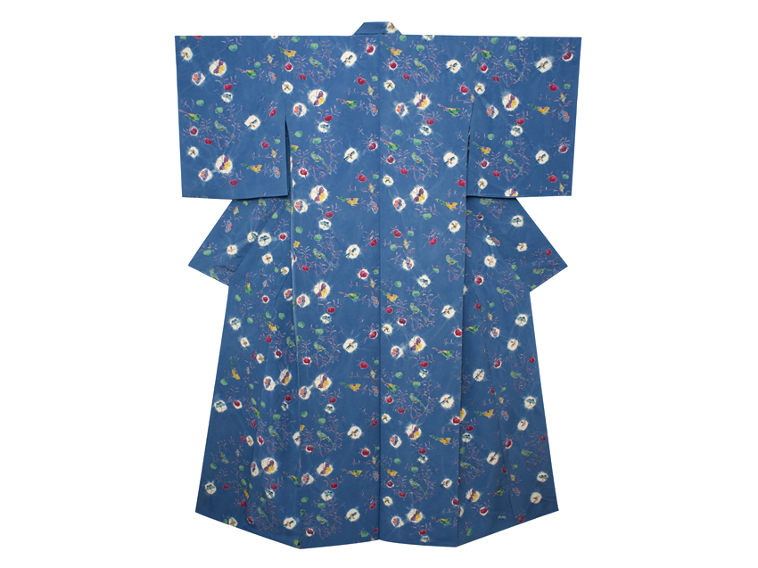 【商品説明】 明るい少しグレイッシュな藍・紺瑠璃色の地色に、鳥や蝶々が楽しげに遊ぶ様子を染めた絞りに型絵染の一方附けの小紋のお着物です。 赤い実のなった柘榴の木にとまっているのは何だか南の島にいそうな尾の長い鳥で、綺麗な緑や黄色で色付けされています。 絞り染めで白く丸い形が染め抜かれた部分には可愛い蝶々やトンボがやはりカラフルに染められています。 お菓子のような可愛い色で染められた模様を目で追っていきますと、あれもこれもと発見があって面白く目に映ります。 色使いも個性的で、特に柘榴の実の浅蘇芳色と葉の木賊色の組み合わせ、紫紺色と黄色の羽の蝶々の色に目を引かれます。 型絵染でありながら線もやわらかく、全体的に透明感のある水彩画のようなタッチで優しい雰囲気です。 今回のイベントにご紹介させていただいております、林郁さんの吉野格子の無地や暈しの帯も綺麗に合いそうです。 川村成さんの段変りのカラフル木綿の帯も楽しいかもしれません。 工芸的なお着物がお好みの方には嬉しい悩みが増えそうな、きっとお出かけが楽しみになりそうなおすすめの一点です。 紺瑠璃色は「#355a85 WEB色見本」を、 浅蘇芳色は「#63283e WEB色見本」を、 櫨染色(はじぞめいろ)は「#d9a62e WEB色見本」を、 木賊色(とくさいろ)は「#3b7960 WEB色見本」を、 紫紺色は「#4d364b WEB色見本」を、 緑黄色は「#ccbd16 WEB色見本」をご参照下さい。