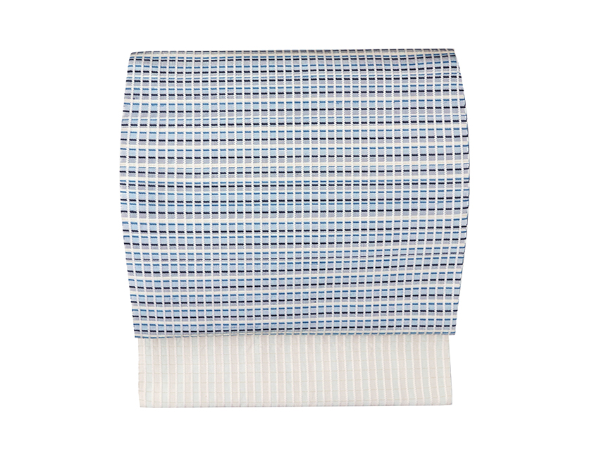 地織の部分に白と水浅葱色の縞が見えてそれだけでも素敵なのですが、お太鼓部分にはさらに複雑な藍色の濃淡が面白く配置されていて、リズミカルな楽しさと清々しさを感じられます。