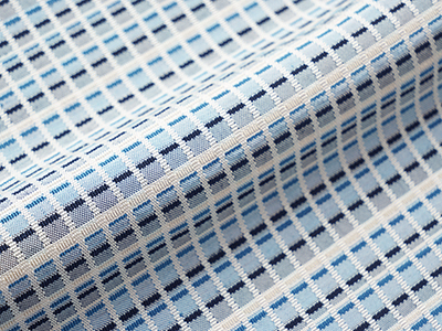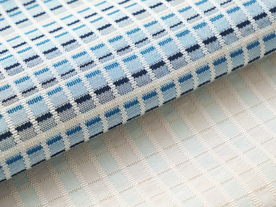 白の吉野格子に黒に近い濃い藍色と明るい藍色の線が交わり、その間の四角は明るい浅縹色ともう少しグレー味のある青舛花色の繰り返しとなった、シャープさもあり小さな四角に可愛らしさもある素敵な模様です。