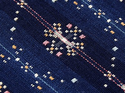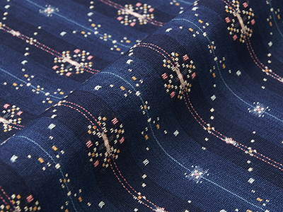 地織の藍の色の清々しさと、紅白の捩り糸と小さな絣を抱き込んで縦に流れるグラデーションが見事です。