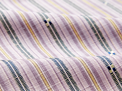 透明感のある淡い紫が吸い込まれるようなグラデーションの縞となって、それにくさぎ、きはだ、藍で重ね染めたニュアンスのある素敵な色の線が走り、小さな市松の道屯織が散らされています。