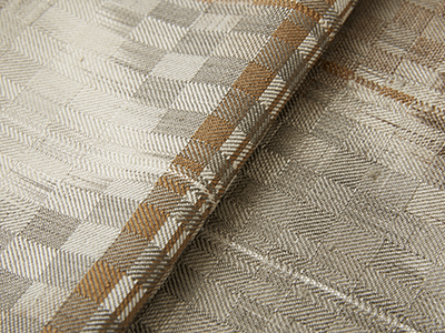 そんな風景が伝わってくるように、濃い茶色味のあるグレー・檳榔子染色からだんだんと淡く変化していく、利休白茶色までの暈しの妙味が茶褐色を加えて見事に織り表されています。