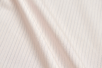 少し離れると、シルエットのように表された淡いグレーの縞絣が、淡いピンクの地色に優しく溶け込んで無地のように見える細縞の着尺です。