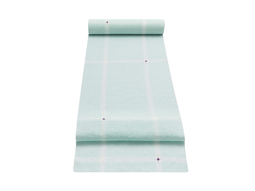 樋口作品ならではのデザイン、浅葱色に白の格子を暈したように通した、とても珍しい色合いの小千谷縮の着尺です。