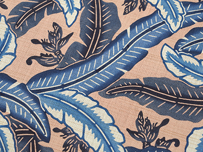 こちらは風にそよぐ大きな芭蕉の葉を藍の濃淡で、地色をコーラルピンクにしてみましたら、軽快でやさしさのある素敵な帯になりました。