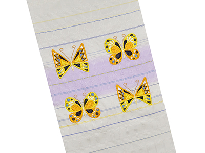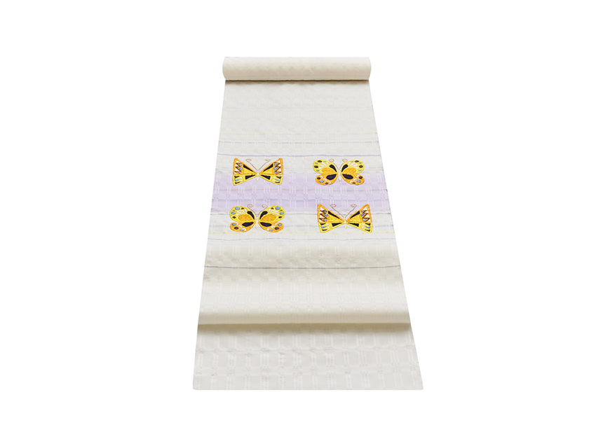 こちらは絹糸で織っていただいた吉野格子の名古屋帯地に、お太鼓の部分にカラフルな蝶々が織り出されたものです。