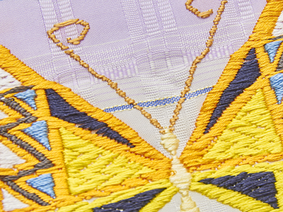 吉野格子に薄紫色の暈しの地は、格調ある大人の雰囲気なのですが、オレンジと緑味のある黄色の羽根を広げた蝶々が個性的で、お召しいただきますと素敵なアクセントになる事と思います。