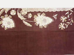 大変細い糸で織られた紫鳶色の古い結城紬の様な紬地に、レース模様を取り入れた草花の更紗模様が手描ロウケツで描かれた古い帯地が手に入りました。
