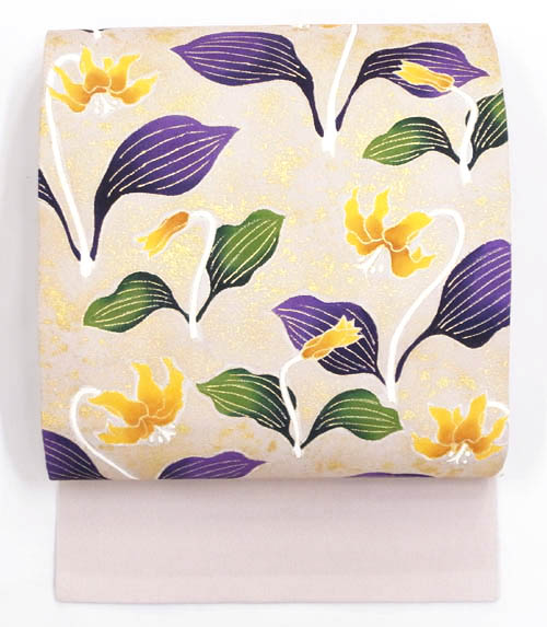 グレー味を帯びた藤色の縮緬の中に、少し元気の良いイメージで群生するカタクリの花が友禅で描かれた素敵な名古屋帯です。