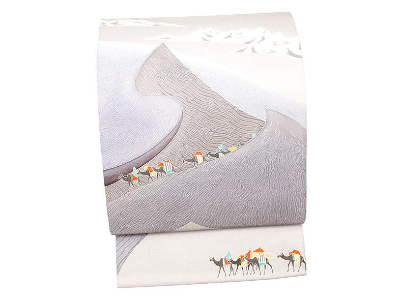 こちらはいつもその品格ある色使いと、繊細でたおやかに図案を描く線の美しさにうっとりとしてしまう、日本工芸会正会員・坂井教人氏作の「砂漠」がテーマの友禅の袋帯です。